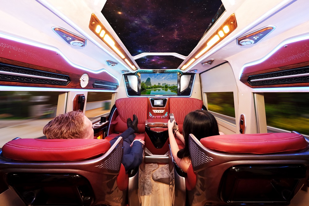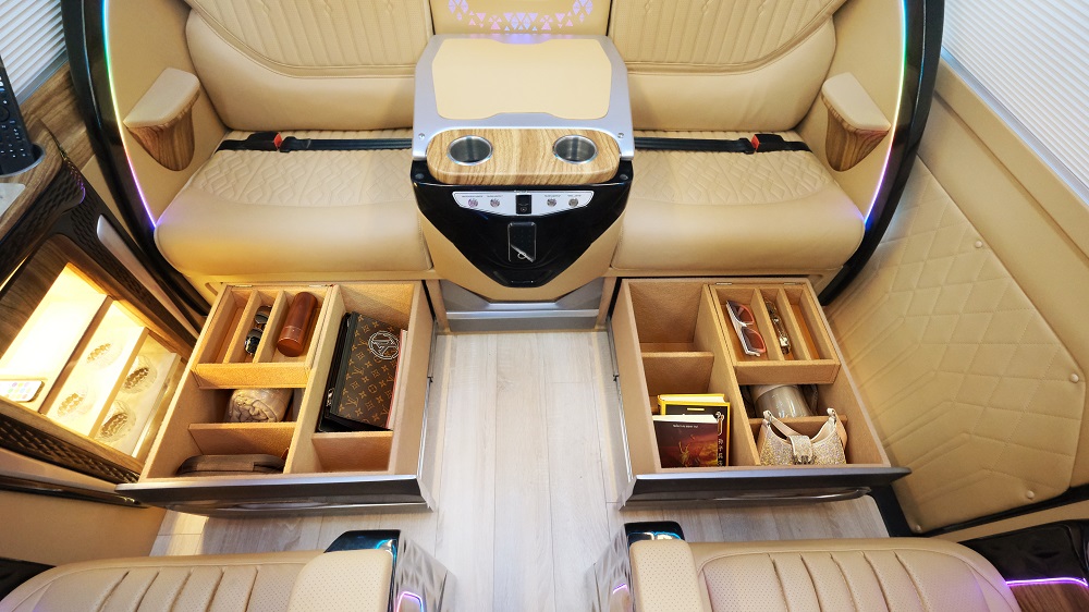 - 2 ghế vip diện tích ngồi bao la, nệm ghế được đúc nguyên khối tạo sự êm ái và ổn định khi xe di chuyển. Form ghế thiết kế với dài đèn viền tinh tế, có thể điều chỉnh tư thế nằm thoải mái nhất và ngã 180 độ thành 1 chiếc giường cho chuyến đi hoàn toàn thư giãn. Bàn tiện ích tích hợp trong gác tay. Option trang bị hệ thống massage túi khí để giải tỏa áp lực lên cột sống sau một ngày làm việc di chuyển bộn bề…tất cả kết thành chiếc ghế không chỉ sang trọng mà còn tốt cho sức khỏe xứng tầm chủ nhân. – Ghế băng 3 được lên thiết kế kỹ lưỡng với 2 công năng vừa là băng ghế sofa như đang ngồi trong phòng khách ở nhà, khi cần cũng có thể ngã thành 1 chiếc giường rộng rãi và êm ái.