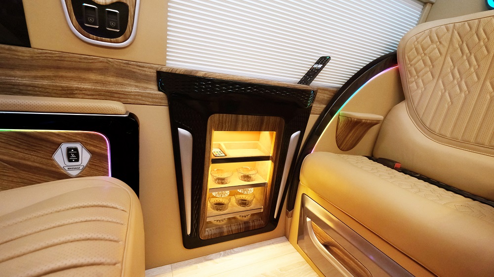 - 2 ghế quầy bar có thể đóng mở tiện dụng tạo không gian linh hoạt cho xe khi kết hợp với chiếc bàn chỉnh điện bất cứ khi nào chủ nhận cần có một phòng hội nghị di động.
