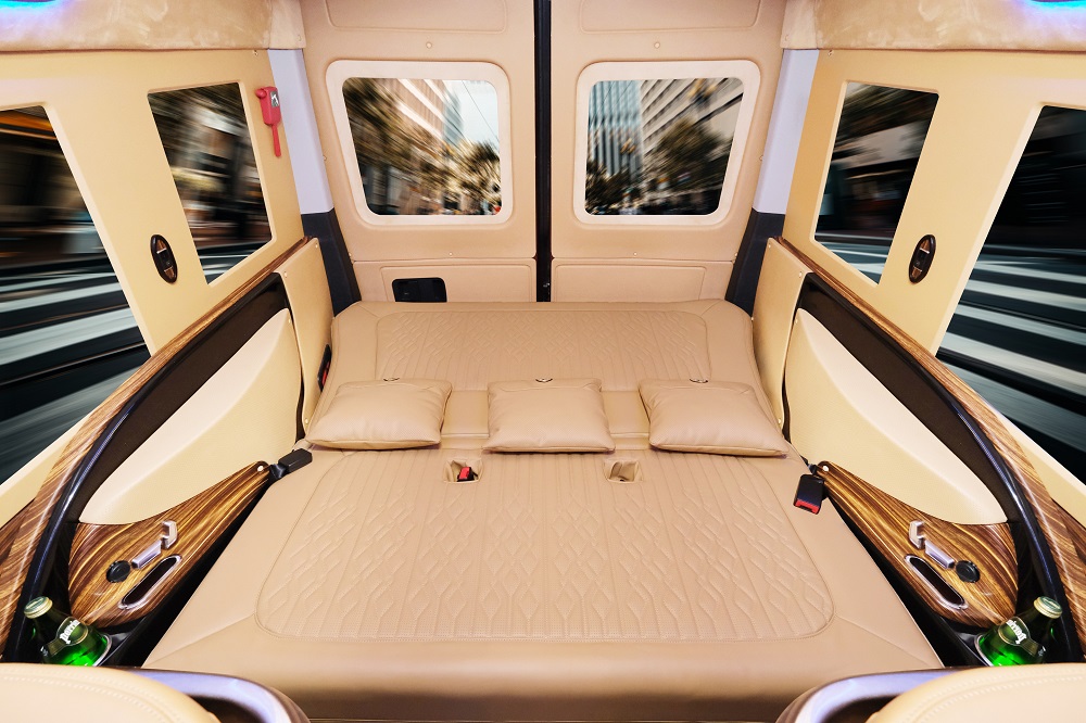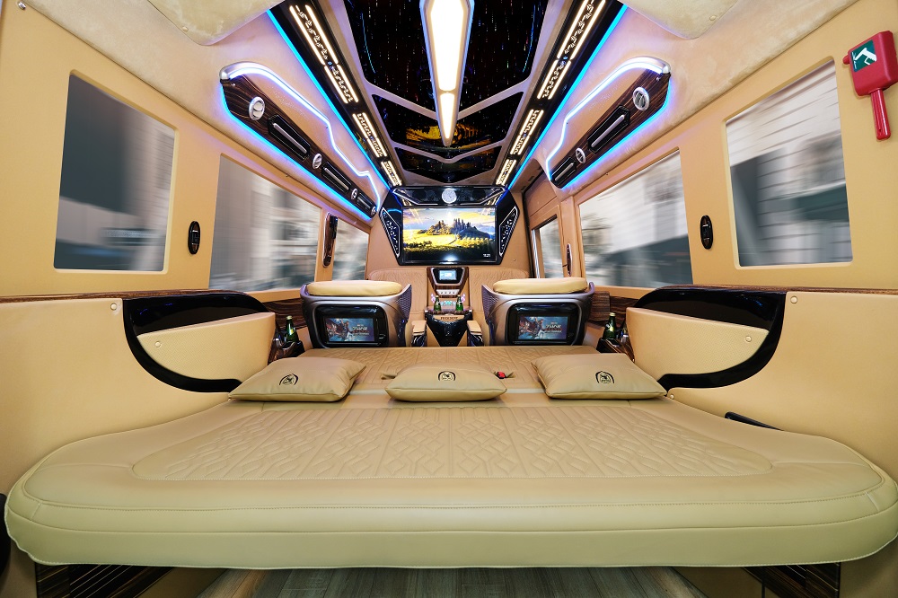 - Khoang ghế VIP 7 chỗ với ghế băng ba chuyển thành giường, chất liệu da thật, ốp vân gỗ cao cấp. Với nội thất cao cấp, đầy đủ tiện nghi, quý khách sẽ hoàn toàn thoả mãn tiêu chí vừa làm việc, vừa thư giãn.
